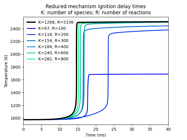We then create a sequence of reduced mechanisms including only the top reactions and the associated species, and run the simulations again with these mechanisms to see whether the reduced mechanisms with a certain number of species are able to adequately simulate the ignition delay problem.